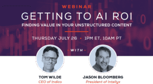 Business Getting to AI ROI: Finding Value in Your Unstructured Content July 31, 2018 by adamdev Last week, Indicoās CEO Tom Wilde and Intellyxās Jason Bloomberg’s held a practical webinar to get businesses started on their AI journey to success. If you missed it, the slides and video are now available below. Overview: Artificial Intelligence is definitely having its moment, but if youāre like most companies, you havenāt yet been able […] Read more Ā»
