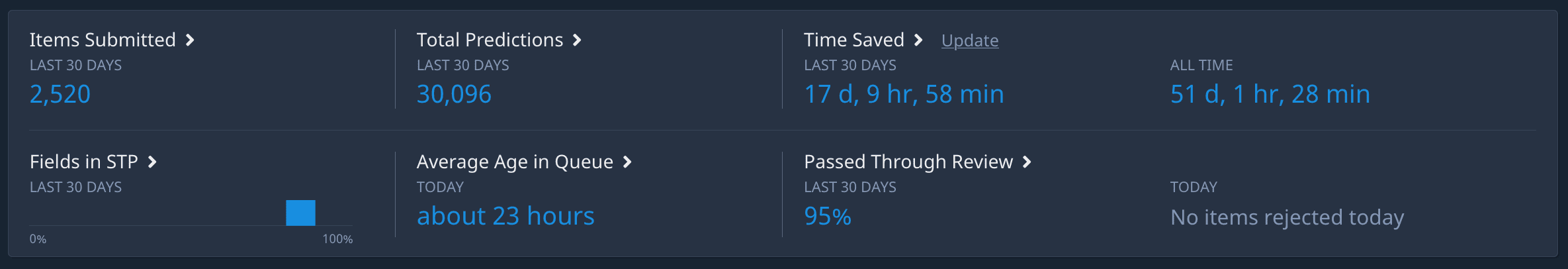 - Straight through processing is also measured at the model and field level for more in depth understanding about how your extraction models are performing within a workflow, and where those models are having success by field.