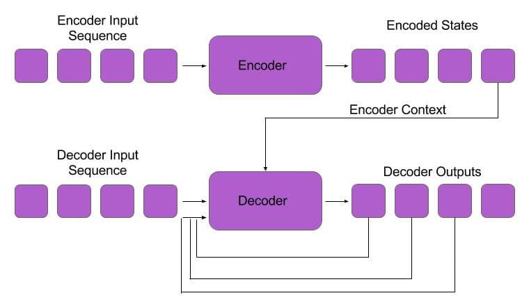 Figure 3: Sequence to Sequence Model – the encoder outputs a sequence of states. The decoder is a language model with an additional parameter for the last state of the encoder.