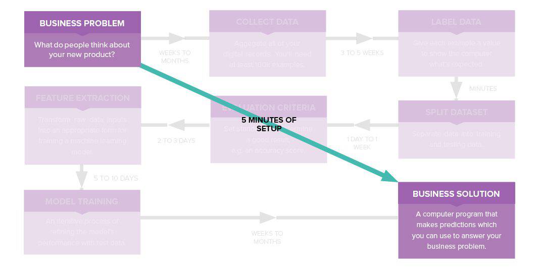 So…why isn’t everyone doing it? Well, even for an expert in the field, it often requires months of experimentation to develop a model, and there is no guarantee that the model will provide a scalable solution to your business problem. That’s tens of thousands of dollars and a whole lot of risk for your business. On the other hand, hiring a third party service allows one of your software developers, with no specialised training in machine learning, to integrate the power of machine learning into your company in just a few lines of code.